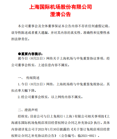 上海机场发布澄清公告,今日网传,上海机场将与中免重签免税协议,其扣点率大幅下降。经公司董事会核实,以上网传内容不属实。经核实,目前公司与日上免税行(上海)有限公司相关事项按《上海浦东国际机场免税店项目经营权转让合同之补充协议》执行。具体内容请详见公司于2021年1月30日披露的《关于签订免税店项目经营权转让合同之补充协议的公告》(公告编号:临2021-002)。