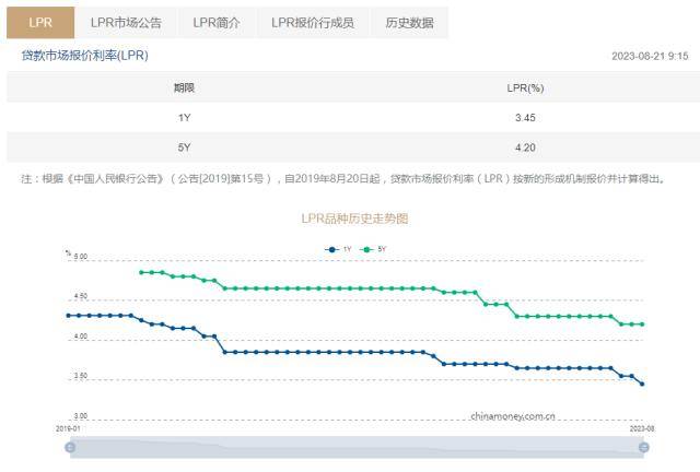 今日早间,中国人民银行授权全国银行间同业拆借中心公布,2023年8月21日贷款市场报价利率(LPR)为:1年期LPR为3.45%,较上月下降10个基点,5年期以上LPR为4.2%,与上月持平。