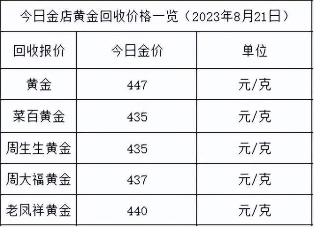 今日金价保持不变,黄金回收价格则是微涨,涨幅为2元/克。同时,每个品牌的回收价格也不一样,小金大致整理了几个,详见下表,数据仅供参考: