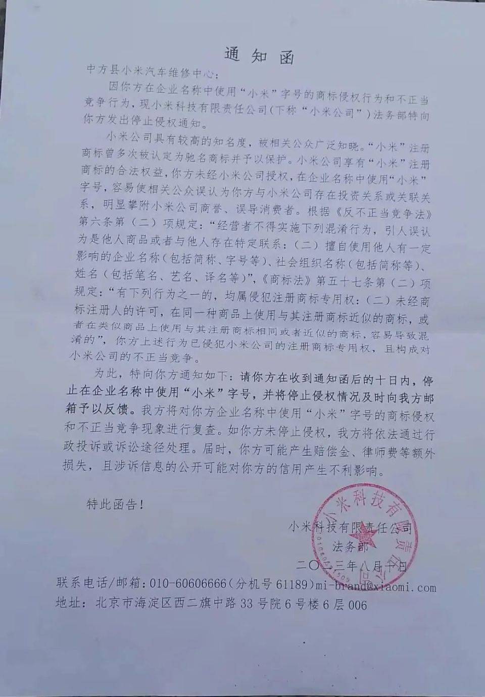 《侵权通知函》显示,“小米汽修”带有“小米”字样,小米公司认为,“小米汽修”已侵犯小米公司注册商标专用权,且构成对小米公司的不正当竞争。