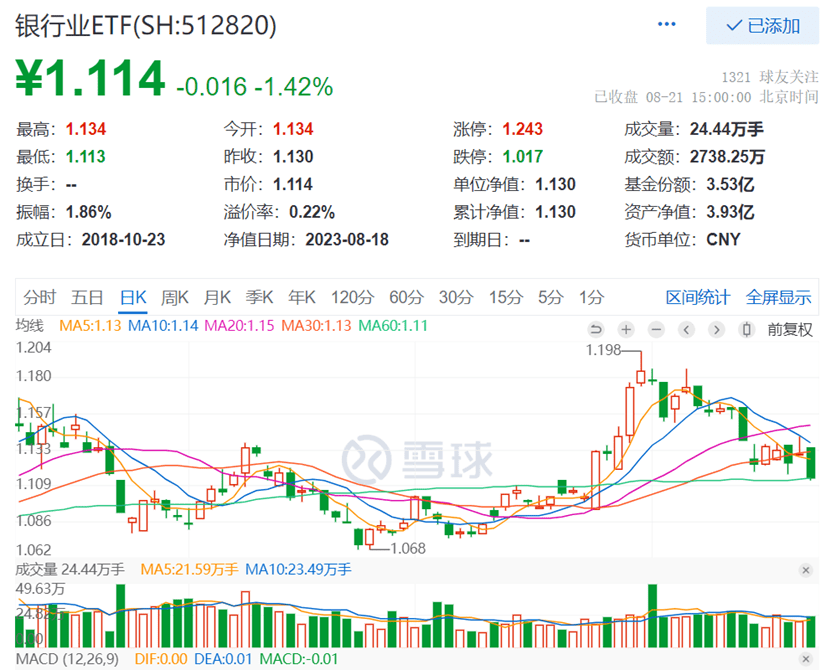 主要ETF方面,银行业ETF(512820)随指数下挫,收跌1.42%,成交额超2700万元,放量回调,回踩60日均线!