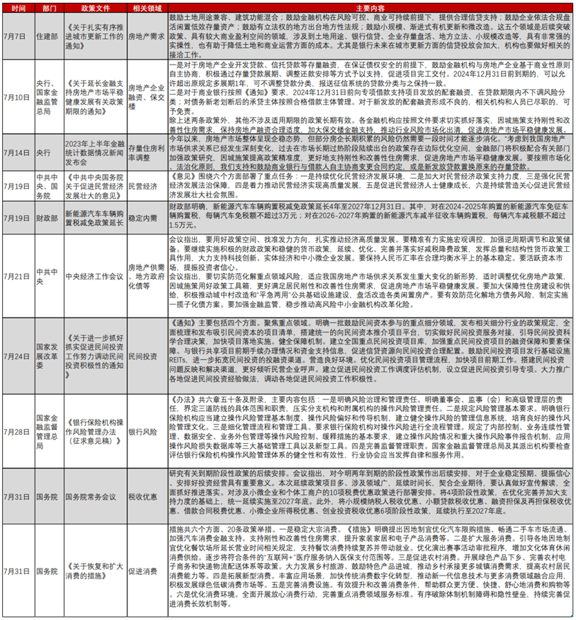 7月以来各部门集中出台了一系列经济刺激政策。政策范围涵盖住房、消费、促进民营企业发展等多方面。其中中央经济工作会议关于房地产供求关系发生重大变化,没有提及房住不炒;制定实施地方一揽子化债方案以及活跃资本市场的表述都释放了非常强烈的信号,此轮政策的大规模出台标志着政策底的到来。(来源:中泰证券《银行业月度跟踪:系列刺激政策出台,前期超跌银行大幅反弹》)