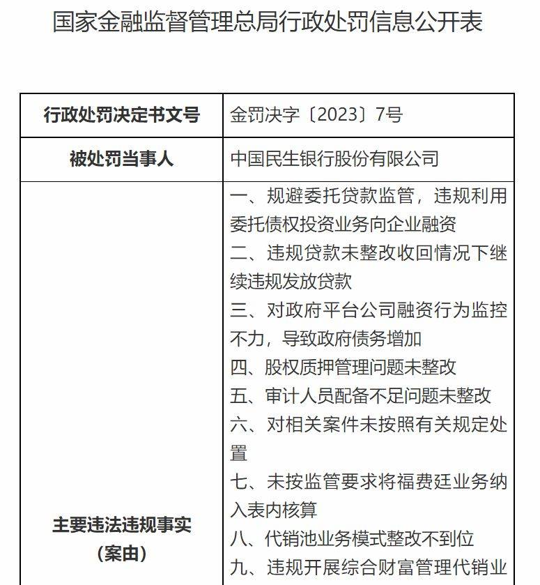 另据金罚决字〔2023〕7号,民生银行涉及14项违法违规,罚款合计4780万元。其中,总行4430万元,分支机构350万元。具体包括,规避委托贷款监管,违规利用委托债权投资业务向企业融资;违规贷款未整改收回情况下继续违规发放贷款;对政府平台公司融资行为监控不力,导致政府债务增加;股权质押管理问题未整改;审计人员配备不足问题未整改等。