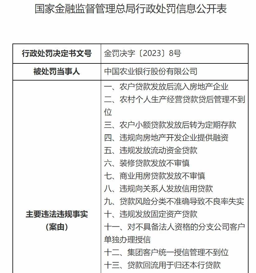 此外,金罚决字〔2023〕8号显示,农业银行涉及19项违法违规,没收违法所得并处罚款合计4420.18万元。其中,对总行罚款1760.09万元,没收违法所得60.09万元,对分支机构罚款2600万元。具体包括,农户贷款发放后流入房地产企业;农村个人生产经营贷款贷后管理不到位;农户小额贷款发放后转为定期存款;违规向房地产开发企业提供融资;违规发放流动资金贷款;装修贷款发放不审慎;商业用房贷款发放不审慎;违规向关系人发放信用贷款;贷款风险分类不准确导致不良率失实等。