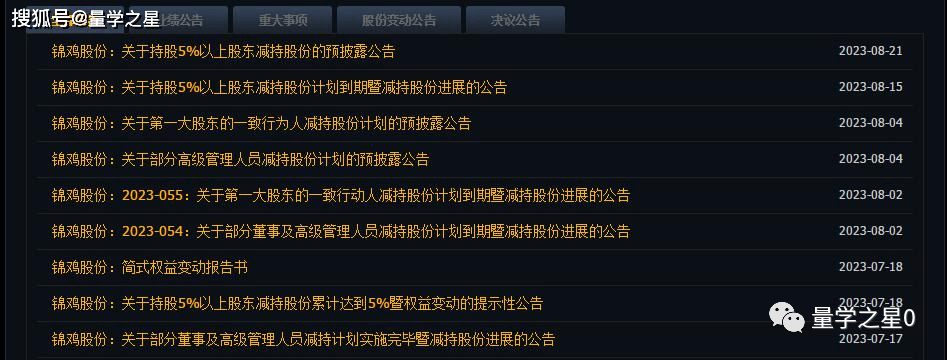 更骚的锦鸡股份近2个月内发布的9则公告居然全是和减持有关,要么是高管减持完毕,要么是另外一个高管减持预披露,要么就是实控人减持进展……