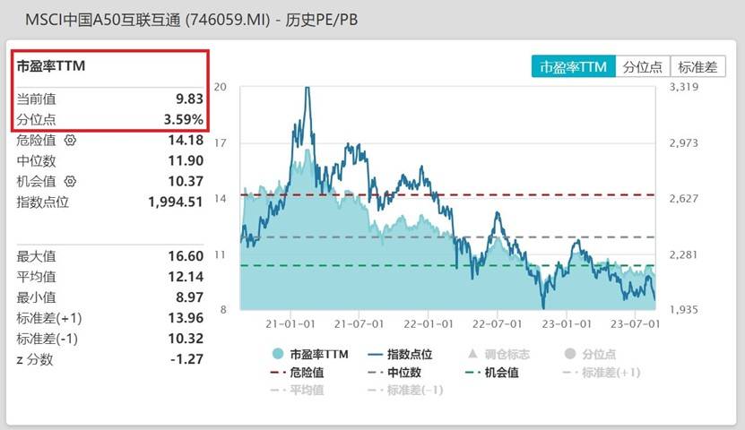 截至2023年8月21日,MSCI中国A50指数最新PE仅9.83倍,处于近三年3.59%的分位,低于近三年来96%以上的时间区间,估值性价比凸显!