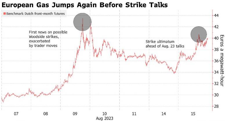 由于澳大利亚天然气厂罢工问题持续发酵,欧洲天然气价格跳涨。如果周三的薪资谈判未能达成协议,澳大利亚一个关键出口项目服务的工人准备罢工。荷兰近月天然气价格一度飙升18%,随着劳资谈判的拖延,交易员预计会出现更多动荡。澳洲工会周末称,如果Woodside Energy Group(WDS.US)与工会官员定于周三举行的新谈判无法在薪资、工作环境等问题上谈拢,澳大利亚液化天然气(LNG)行业的罢工行动最早可能在9月2日开始。此外,雪佛龙工厂的工人也在就潜在的罢工行动进行投票。此外,雪佛龙(CVX.US)的工厂工人上周开始就可能的罢工进行投票。