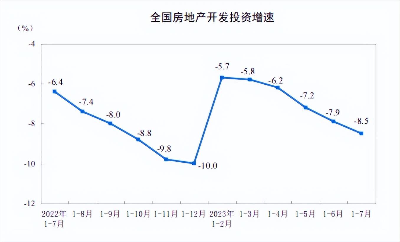 与此同时,1-7月份全国房地产开发投资额同比下降8.5%,降幅较上月扩大0.6个百分点,至此,开发投资额连续15个月负增长;同期,全国房屋新开工面积同比下滑24.5%,连续23个月下跌。