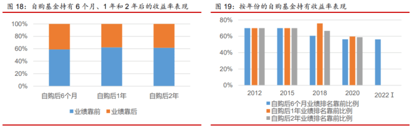 华宝证券统计分析 2012 - 2022 十年间的公募基金自购发现,从权益型基金自购组合的回测结果看,每波自购潮中权益基金组合表现明显好于比较基准,具备超额收益优势。且除了受到市场系统性影响的今年之外,其他自购潮均收获了绝对收益。基金公司对普通股票型和高权益仓位混合型基金的筛选能力较强,能够较好地把握标的特征并最终选择优秀、合适的标的进行自购。