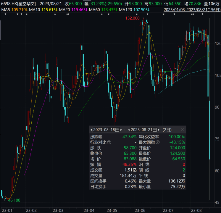 受此事件影响,上周五8月18日,星空华文在港股的股价出现大跌,创出上市以来最大单日股价跌幅,截至收盘暴跌23.43%,收报94.95港元,总市值跌至378.4亿港元,一日之内公司市值蒸发超百亿港元。