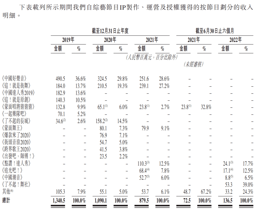 据了解,《中国好声音》是星空华文旗下最大的综艺IP。在星空华文招股书显示,《中国好声音》所属的综艺节目IP制作、运营及授权业务(简称综艺IP业务)是星空华文的收入核心,2022年星空华文实现营业收入8.73亿元,其中来自综艺IP业务的收入为7.02亿元,占比80.41%。