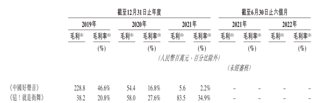 但是这几年,《中国好声音》的盈利能力正在加速变弱。财报显示,2019年-2021年,《中国好声音》贡献营收分别为4.91亿元、3.25亿元、2.52亿元。毛利率方面,2019年该节目的毛利率为46.6%,2020年毛利率下降至16.8%,2021年毛利率仅为2.2%。