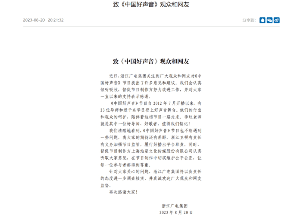 针对此事件,8月20日晚,浙江广电集团就近期《中国好声音》节目引发的争议作出回应,表示将进一步调查核实,并接受广大观众和网友监督。