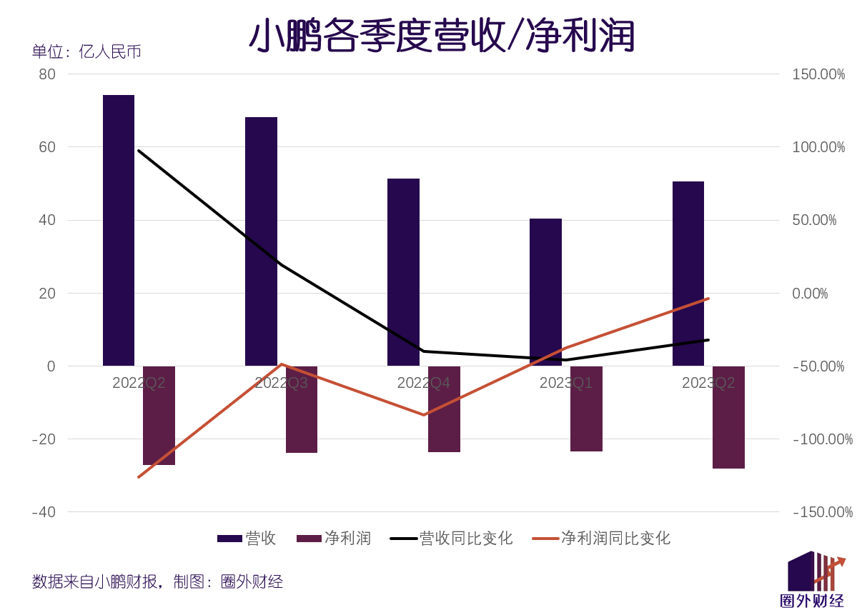 先分析营收的情况。补贴退坡、出售碳积分的高光时刻也已经过去,造车新势力的营收只能全靠卖车这个主业上。二季度,小鹏卖车收入为44.2亿元,远不及去年同期的69.4亿,也稍低于市场预期的45亿元。主业不争气,小鹏的压力可想而知。