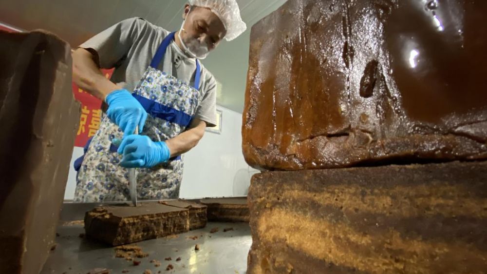 ▲“古法”师傅正直播现切红糖。摄影杨野