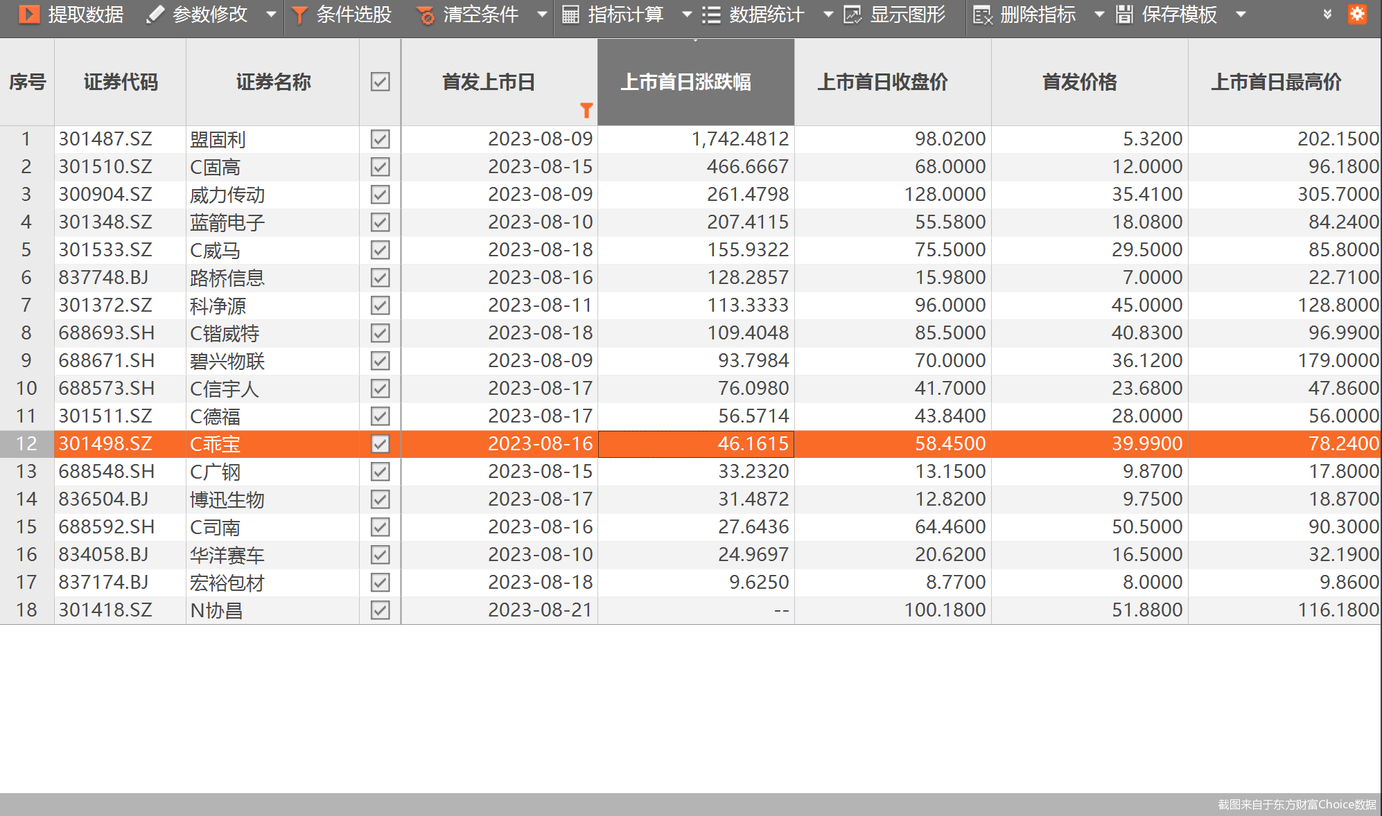 东方财富Choice数据显示,8月9日-21日,A股共有18只新股上市,除了威力传动、盟固利外,还有锴威特、威马农机、路桥信息、固高科技、蓝箭电子、科净源6股上市首日涨幅超过100%。