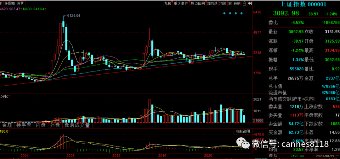 8月21日,A股偏弱,上证指数破了3100点,纵观历史,过去20多年A股上证指数技术上有一个趋势线上的大支撑,如今位置大致在2960附近。从技术概率看,也就100多点左右的下跌空间,投资人可以考虑搏一搏概率。目标是上证50里面负债率、市盈率较低的股票,大盘下跌阶段,可以重点关注公用事业和消费类的权重股避险。