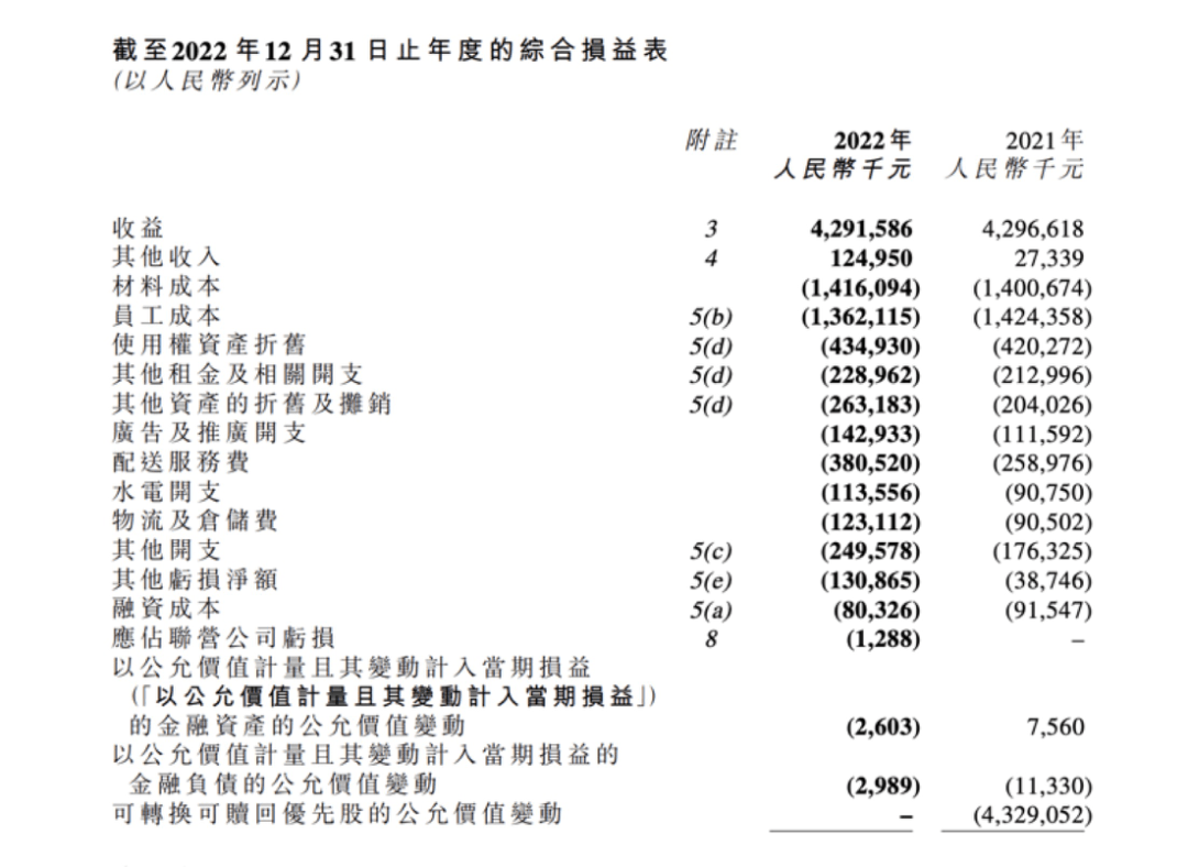 此前,奈雪的茶在招股书中透露,2020年其材料成本、员工成本以及租金成本占总收益的比例分别为38.4%、28.6%和3.1%,三项总和超过30%。这意味着,在不刨除广告营销、资产折旧以及日常水电开支的情况下,奈雪的茶只有不到30%的利润。而现实是,即便在上市之后奈雪的茶一直试图通过降本增效提升利润率,但至今仍未实现盈利。
