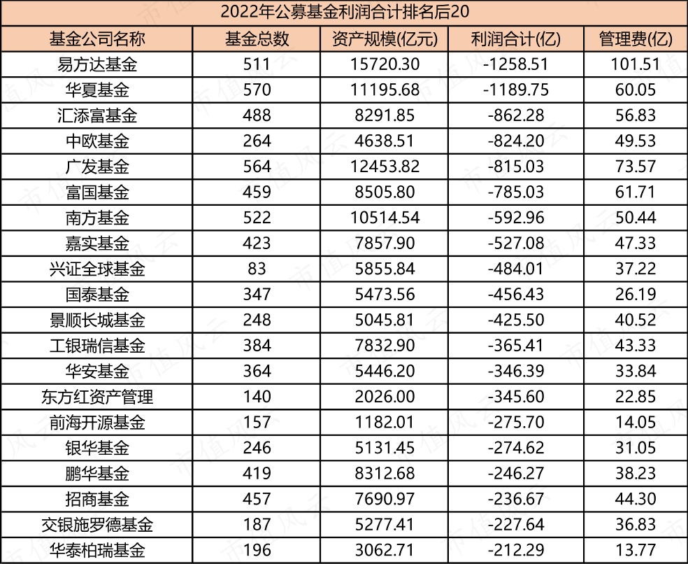 易方达、华夏基金、汇添富基金霸榜2022年亏损前三,分别亏1258亿、1189亿和862亿,但管理费却都收了50亿以上。