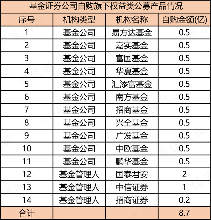截至今日16点,共有14家公募基金及券商发布自购产品的消息,其中11家基金公司均自购5000万,14家机构合计自购金额为8.7亿。