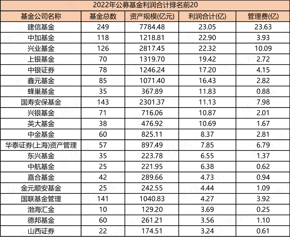 2022年195家公募基金公司里赚钱的只有64家,占比不足35%。其中属建信基金表现最好,赚了23亿。另外中加基金、兴业基金紧随其后,利润合计也突破20亿。