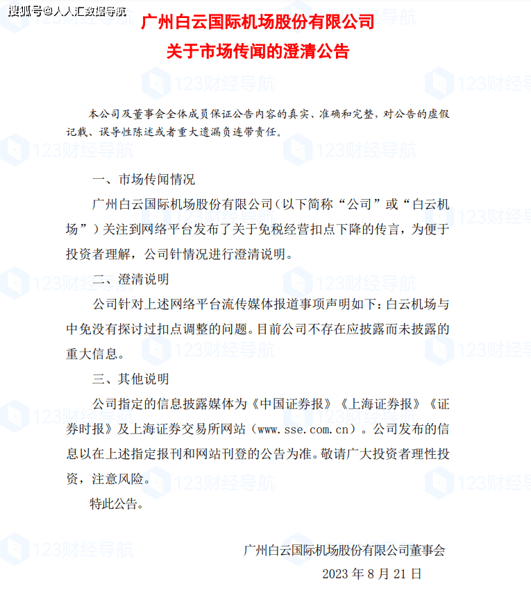 针对市场传闻,白云机场官方进行了回应。首先,针对网络平台发布的关于免税经营扣点下降的传言,白云机场表示与中免并没有讨论过扣点调整的问题,目前公司也没有需要披露而未披露的重大信息