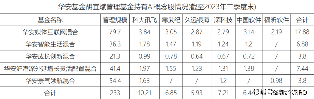 探长简单统计了一下,胡宜斌几只主要基金中,持仓最多的AI概念股是科大讯飞、寒武纪、久远银海、深科技、中国软件等,合计持有规模达40亿元,占其总管理规模的17%。但在部分小市值个股中,胡宜斌的基金已经成为最大多头,成为炒作概念股的主力之一。