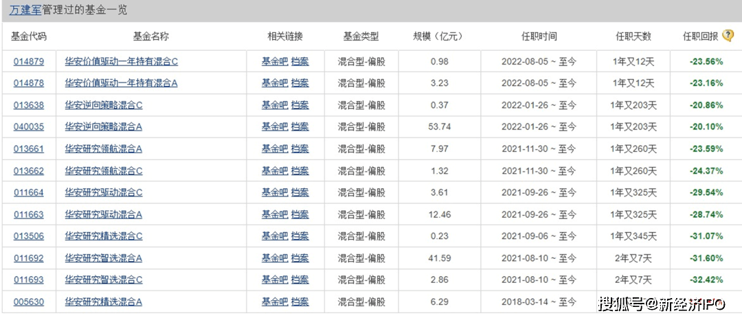 在上述6只基金中,除了最早的代表作华安研究精选(规模只有9亿)外,其余2021年-2022年发行的基金净值全部为亏损状态,净值亏损幅度在-20%-33%之间。按平均亏损25%计算,万建军过去两年给投资人亏损了大约32亿元。