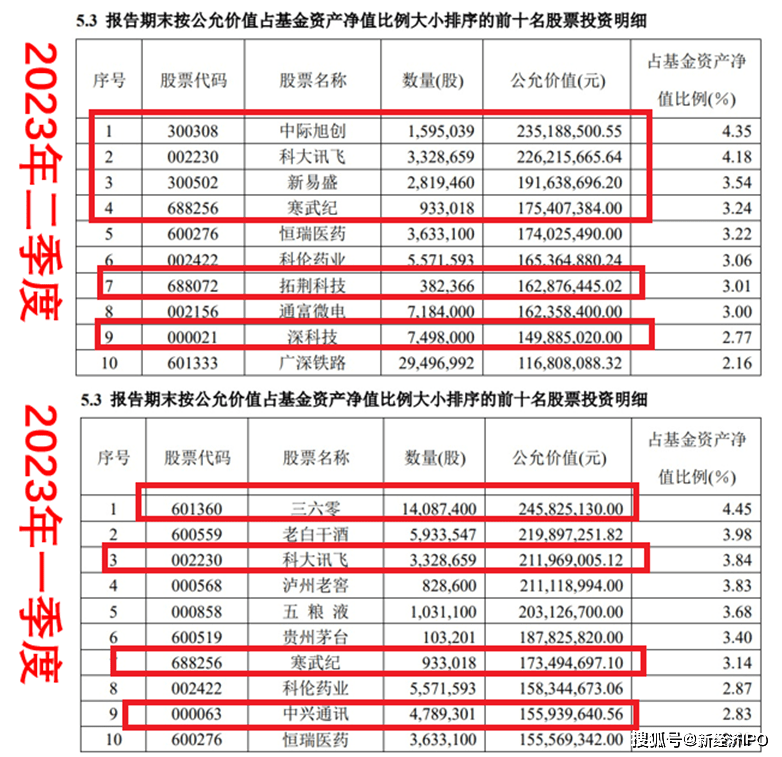 2023年一季度和二季度,华安逆向策略混合基金清仓了新能源和白酒,跑步进场炒作AI概念股,一季度前十大持仓中包括三六零、科大讯飞、寒武纪和中兴通讯,二季度可能是发现光模块(CPO)涨幅更好之后,万建军在高位切换,全力买入CPO概念股,截至二季度末,基金前十大持仓中包括中际创旭、科大讯飞、新易盛、寒武纪、拓荆科技、深科技,AI概念股持仓占比超过20%,市值约12亿元。