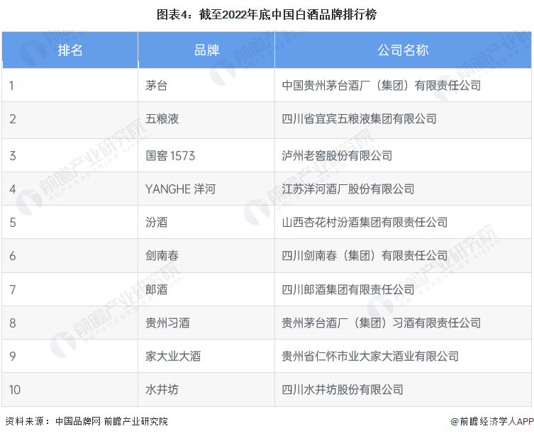 根据中国品牌网公布的信息显示,截至2022年底,茅台高居中国白酒品牌排行榜榜榜首,中国白酒品牌前十名还有五粮液、国窖1573、YANGHE洋河、汾酒、剑南春、郎酒、贵州习酒、家大业大酒和水井坊。