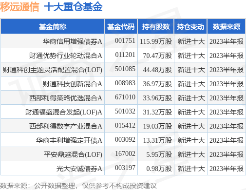 根据2023半年报公募基金重仓股数据,重仓该股的公募基金共11家,其中持有数量最多的公募基金为华商信用增强债券A。华商信用增强债券A目前规模为77.13亿元,最新净值1.441(8月18日),较上一交易日下跌0.35%,近一年下跌4.0%。该公募基金现任基金经理为厉骞。厉骞在任的基金产品包括:华商丰利增强定开债A,管理时间为2019年12月25日至今,期间收益率为113.06%;