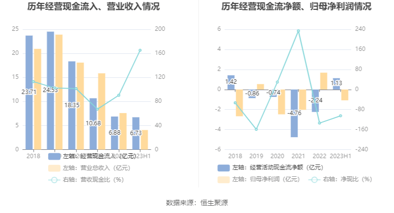 2023年上半年,公司营业收入现金比为165.29%,净现比为-104.92%。