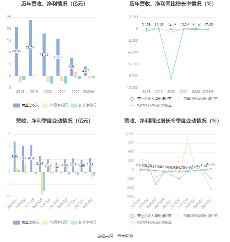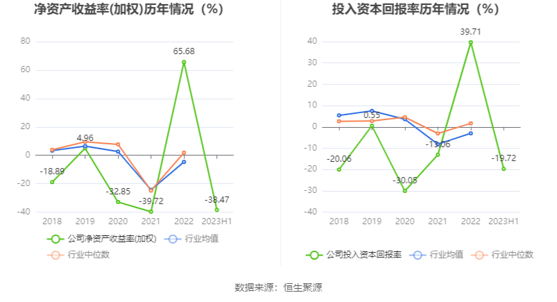 数据显示,2023年上半年公司加权平均净资产收益率为-38.47%,较上年同期下降69.30个百分点;公司2023年上半年投入资本回报率为-19.72%,较上年同期下降31.98个百分点。