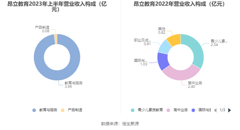 分产品来看,2023年上半年公司主营业务中,教育与服务收入3.99亿元,占营业收入的97.98%;产品制造收入821.77万元,占营业收入的2.02%。