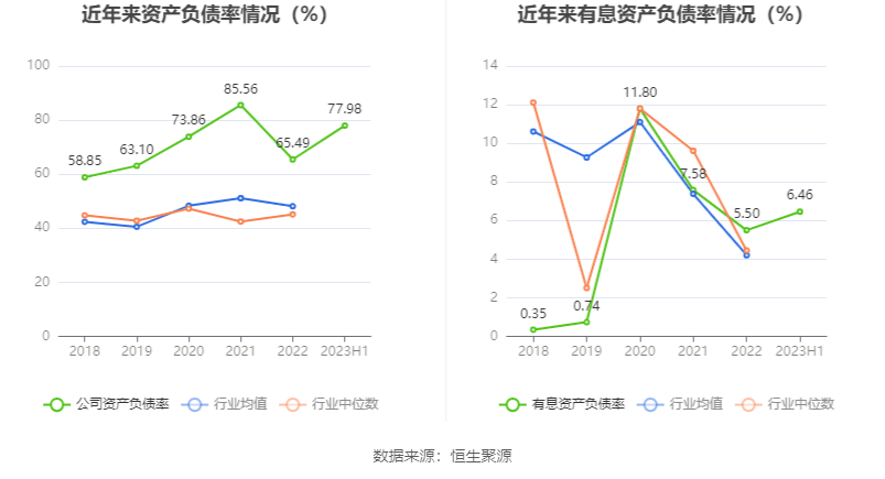 偿债能力方面,公司2023年二季度末资产负债率为77.98%,相比上年末增加12.49个百分点;有息资产负债率为6.46%,相比上年末增加0.96个百分点。