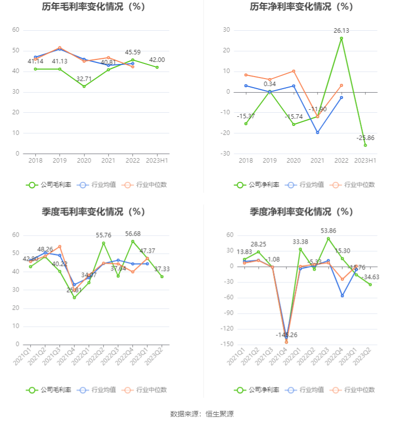 2023年上半年,公司毛利率为42.00%,同比下降1.28个百分点;净利率为-25.86%,较上年同期下降42.80个百分点。从单季度指标来看,2023年第二季度公司毛利率为37.33%,同比下降18.43个百分点,环比下降10.04个百分点;净利率为-34.63%,较上年同期下降29.30个百分点,较上一季度下降18.87个百分点。