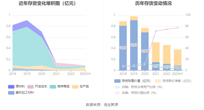 从存货变动来看,截至2023年上半年末,公司存货账面价值为860.17万元,占净资产的4.45%,较上年末减少296.67万元。其中,存货跌价准备为2938.94万元,计提比例为77.36%。