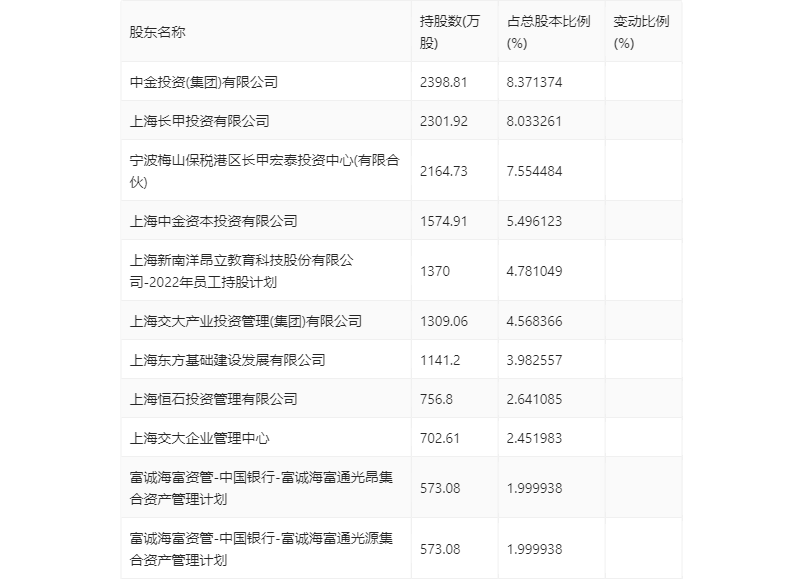 半年报显示,2023年上半年末的公司十大流通股东中,持股最多的为中金投资(集团)有限公司,占比8.37%。十大流通股东名单相比2023年一季报维持不变。在具体持股比例上,上海长甲投资有限公司、上海交大产业投资管理(集团)有限公司持股有所下降。