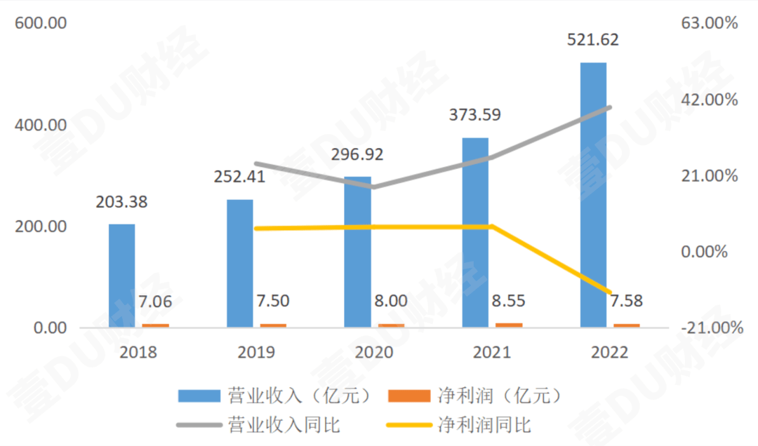 根据的财报数据显示,近五年来的营收和净利润处于一个加速上升的态势,2018年营业收入203.38亿元,净利润7.01亿元,2018-2022年里营收翻了2倍半之多。