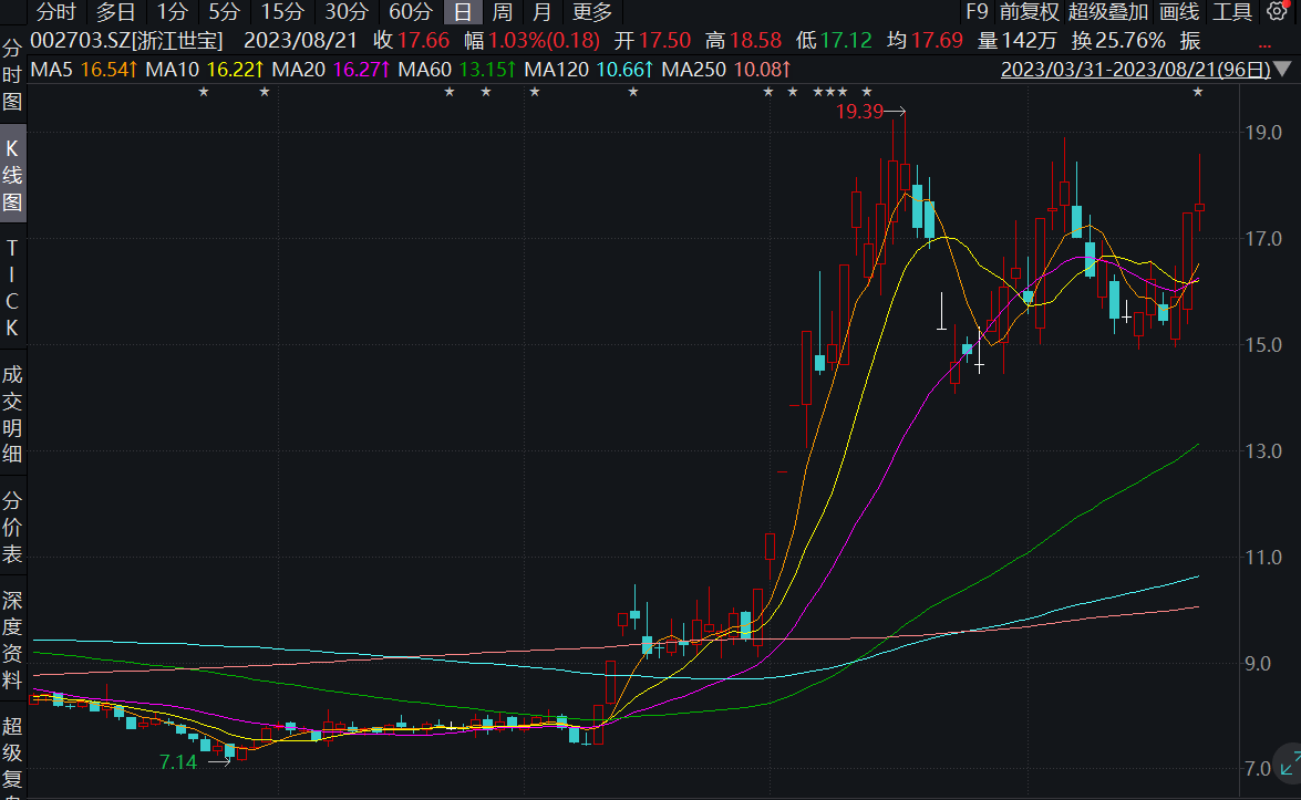 自6月9日启动一轮上涨行情,股价从当日开盘的7.47元一路上涨,至7月18日盘中触及19.39元为本轮高点,期间一共走出了9个涨停板,累计涨幅接近160%。