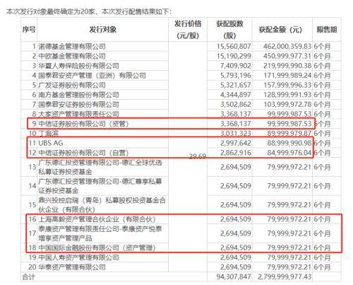 本次发行对象最终确定为20家,参与认购的机构当中,一众知名机构,包括中信证券的资管和自营、中金公司的资管、海外知名机构瑞银集团(UBS AG)、知名险资资管泰康资管、头部私募高毅资产等。此外还有诺德基金、中欧基金、华夏人寿、国君资管(亚洲)、广发证券、南方基金等机构参与。