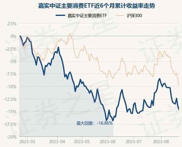 8月21日,嘉实中证主要消费ETF最新单位净值为0.7877元,累计净值为3.9385元,较前一交易日下跌0.81%。历史数据显示该基金近1个月下跌2.11%,近3个月下跌2.61%,近6个月下跌14.64%,近1年下跌10.85%。该基金近6个月的累计收益率走势如下图: