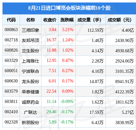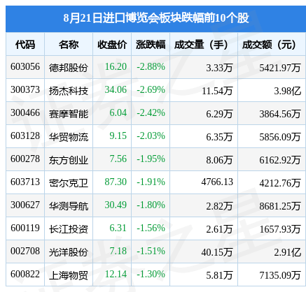 8月21日进口博览会板块较上一交易日下跌1.17%,德邦股份领跌。当日上证指数报收于3092.98,下跌1.24%。深证成指报收于10320.39,下跌1.32%。进口博览会板块个股涨跌见下表: