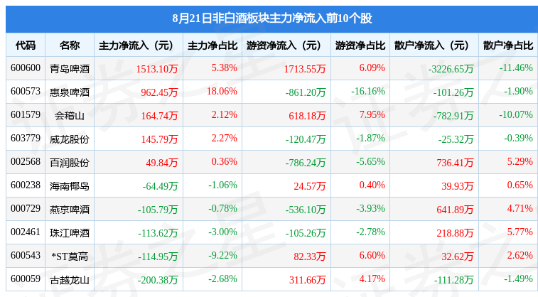 从资金流向上来看,当日非白酒板块主力资金净流出1149.35万元,游资资金净流出505.44万元,散户资金净流入1654.79万元。非白酒板块个股资金流向见下表: