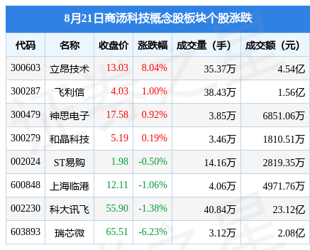 8月21日商汤科技概念股板块较上一交易日下跌1.69%,瑞芯微领跌。当日上证指数报收于3092.98,下跌1.24%。深证成指报收于10320.39,下跌1.32%。商汤科技概念股板块个股涨跌见下表: