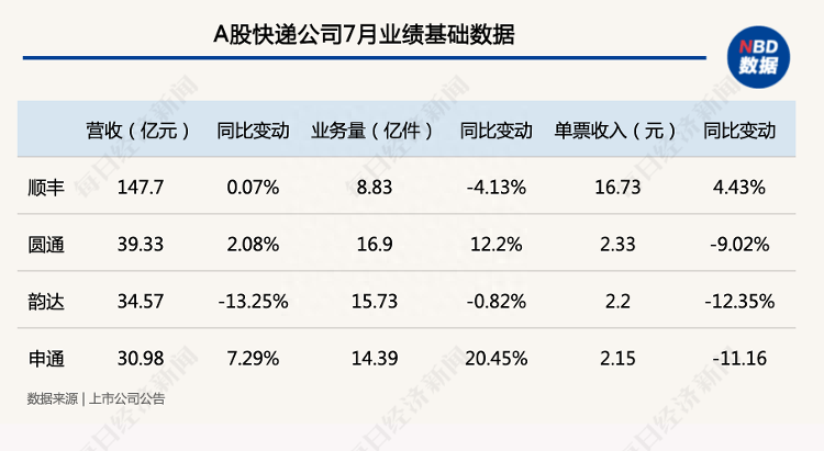 8月18日晚间,A股4家快递公司发布7月业绩,综合各家披露的数据可以看到,快递头部企业的下半年业绩竞争愈演愈烈,其中,申通快递(SZ002468,股价10.41元,总市值159.36亿元)营收和业务量的增速继续领先,圆通速递(SZ600233,股价14.56元,总市值501.19亿元)稳坐加盟制老二的宝座,韵达股份(SZ002120,股价9.84元,总市值285.58亿元)虽然业绩难止下滑,但是其与申通的业务量差距正在拉大,追赶动作明显。