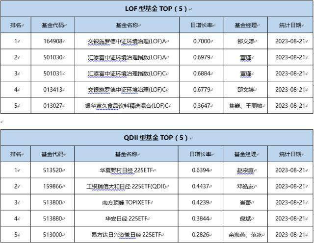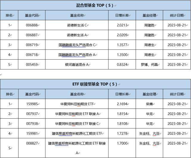 单基金方面,剔除掉 创新封基类型 基金的影响,8月21日业绩表现最好的基金为华夏饲料豆粕期货ETF,日增长率为2.1694 %,其次为诺德新生活C,日增长率为2.0213 %、诺德新生活A,日增长率为2.0209 %。