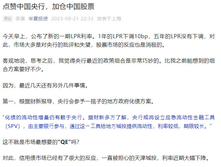 李蓓称我们的央行如此希望洁身自好,非常努力的希望保持正常的利率曲线,一直不希望跟着欧美央行做QE。现在也免不了要参与地方政府的一揽子化债,免不了要推动城中村改造,也就是,免不了要出来多发货币。因为困难到一定程度,发货币总会是最小阻力的方向,央行总是不可不免被赋予重任。于是,现金的长期贬值是不可避免的。股票,是不多的能够长期战胜通胀,保值财富的资产之一。站在此刻,站在中国,利率已经新低,盈利已然企稳,股票资产的性价比格外凸显。并且,以央行最近的一揽子政策来看,以外资最近2周恐慌失望的程度来看,很可能就是又送给大家一个好的买点。