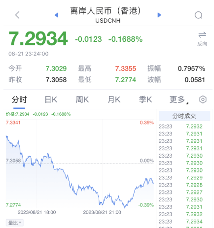 今晚的积极因素之一是人民币的汇率,从咱们A股下午收盘之后,一路走强,接连涨破7.33、7.32、7.31、7.30、7.29五道关口,一度收复7.28关口。日内一度涨了580点,不过目前涨幅有所回落。