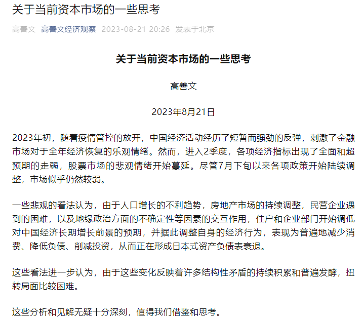 高善文:资本市场的重要改革已开始破题 当前市场往往放大短期悲观因素